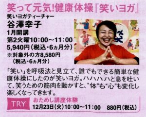 ずっと元気!プロジェクトからのありがたいご縁で、来年1月、豊田中日文化センターに『笑いヨガ』でデビューいたします。